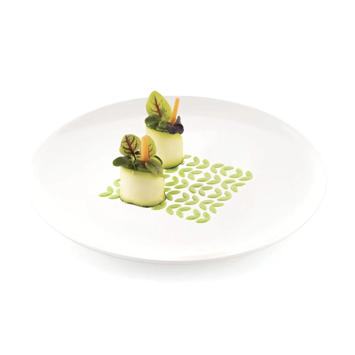 Fabricado en silicón 100% platino ultrafino, el molde es ligero, flexible y fácil de usar. Simplemente coloca el stencil sobre el plato, extiende una gelatina o crema con una espátula y retira para revelar una decoración detallada y profesional en un solo paso.